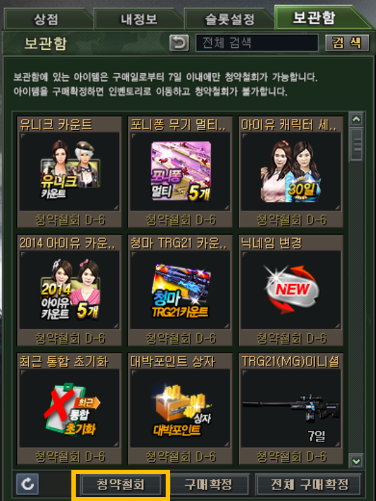[상점/창고]-[보관함]에서 ‘청약철회’ 버튼을 통해 직접 진행할 수 있습니다.