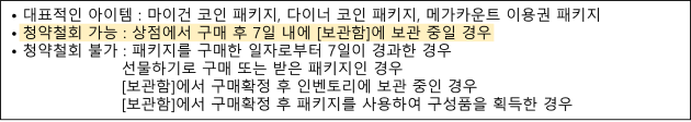 - 아이템 결제창, 공지사항에서 ‘청약철회 불가’로 안내된 아이템