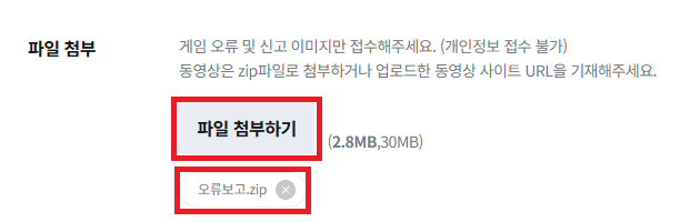 3) 1:1 문의하기 첨부파일 항목에서 “찾아보기”를 클릭하고 압축한 오류보고 파일을 추가합니다.