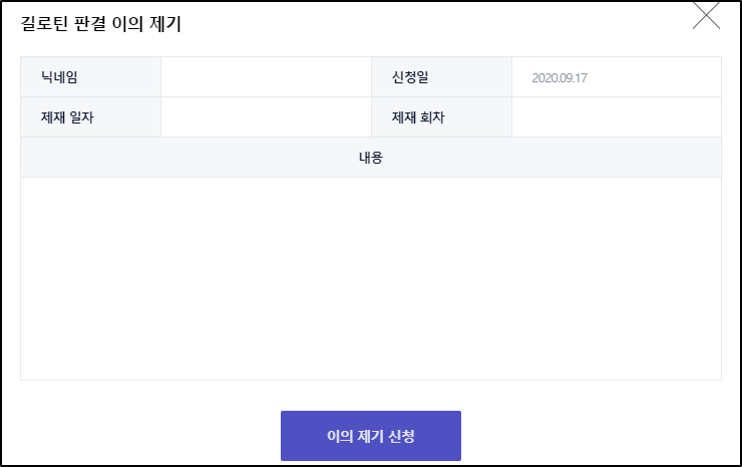 3. ‘길로틴 판결 이의 제기’에서 내용 작성 후 [이의 제기 신청] 버튼을 통해 접수