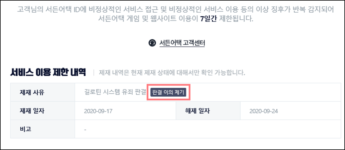 ‘서비스 이용제한 내역’ → [판결 이의제기] 버튼 클릭