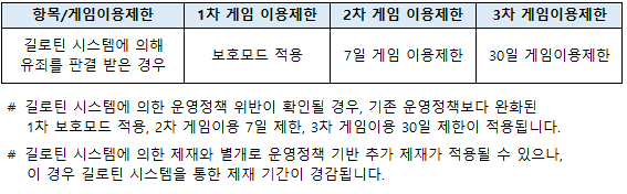 운영정책에 따라 기존에 적용된 길로틴 시스템에 의한 게임 이용제한보다