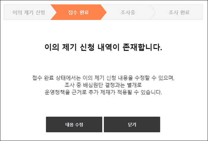 ※ 접수하셨던 이의제기 신청건은 [내용 수정] 버튼을 통해 수정할 수 있습니다.