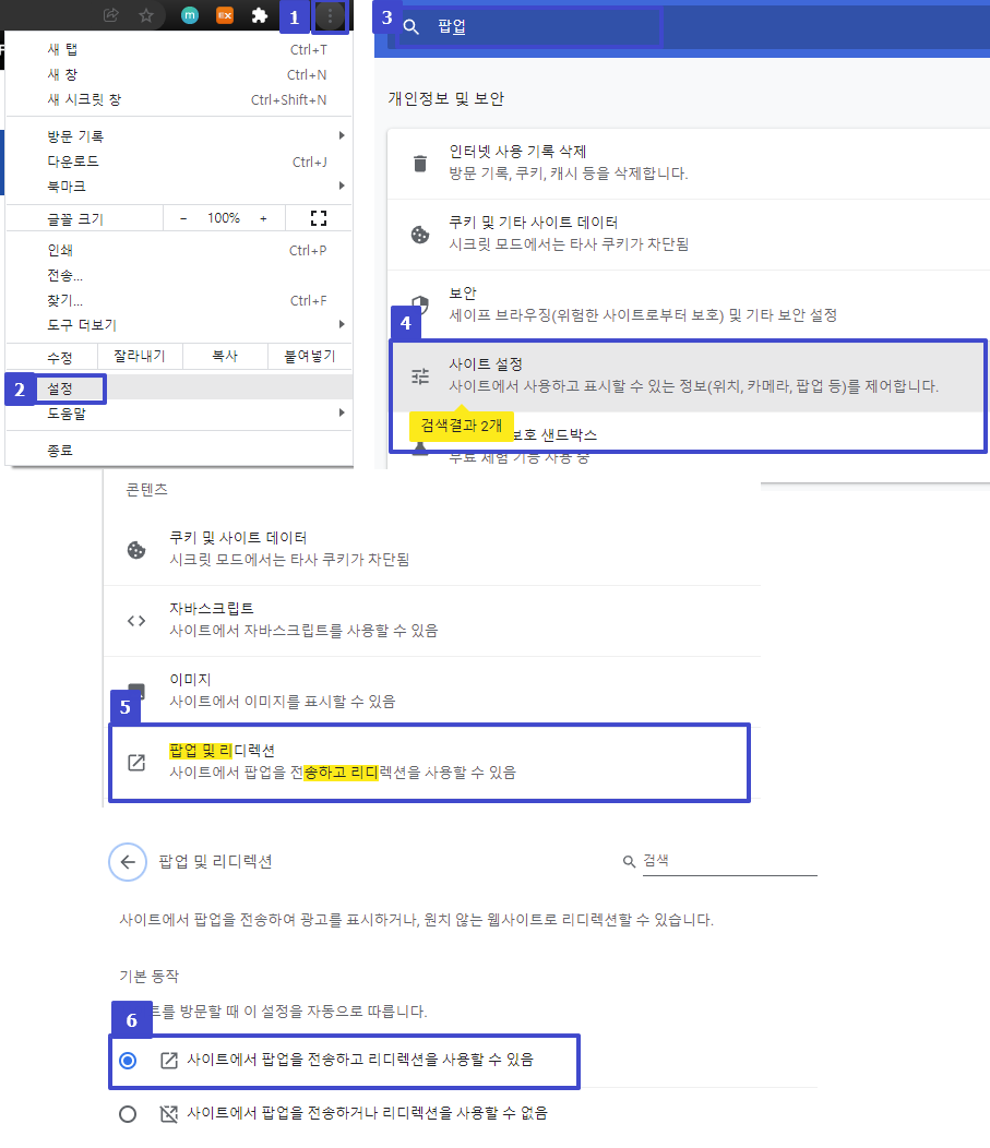 2. Crome 브라우저는 아래의 순서대로 팝업 차단을 해제할 수 있습니다.