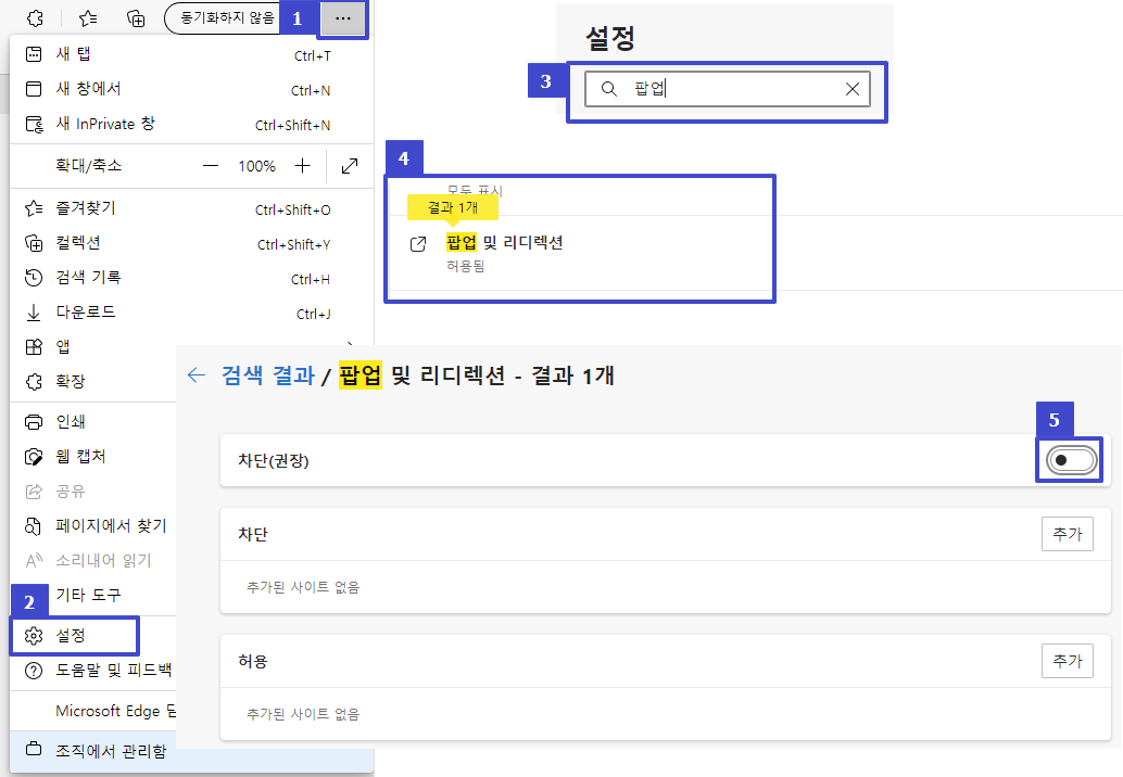 1. Edge 브라우저는 아래 내용 참고하셔서 팝업 차단을 해제하실 수 있습니다.