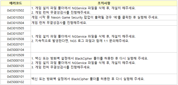 Nexon Game Security 에러코드 별 해결방법을 안내드립니다.