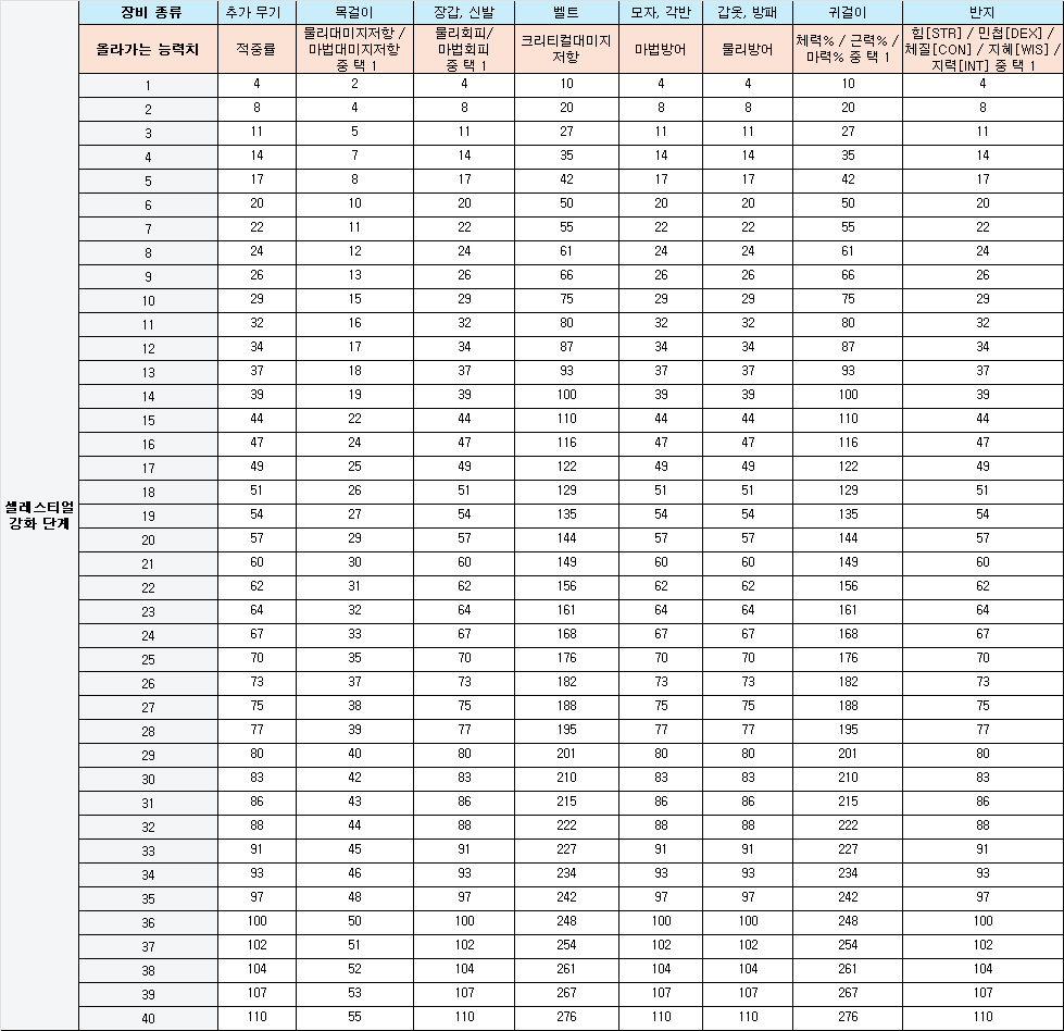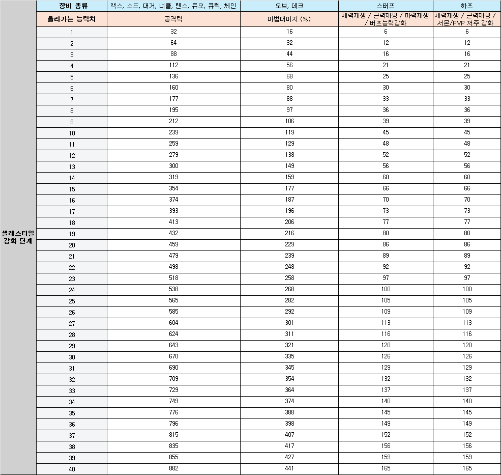 셀레스티얼 강화 단계가 높아질수록 장비의 능력치가 상승합니다.강화 단계에 따라 나의 장비가 얼마나 강해지는 궁금하다면, 다음 내용을 확인해보세요!