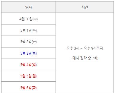 5월 8일(목) 정기점검 이후부터 5월 15일(목) 정기점검 전까지