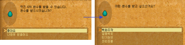 A. 아이템 사용 시 백화주작, 질풍백호, 한기현무, 천뢰청룡 중 1마리 환수알을 선택하여 획득할 수 있습니다.