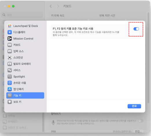macOS에서 기능 키는 ‘fn + 기능 키’를 눌러 사용되는 조합 키 방식으로 되어 있으며