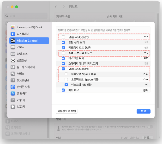 시스템 설정 → 키보드 → 키보드 단축키... → Mission Control에서 아래 옵션 비활성화